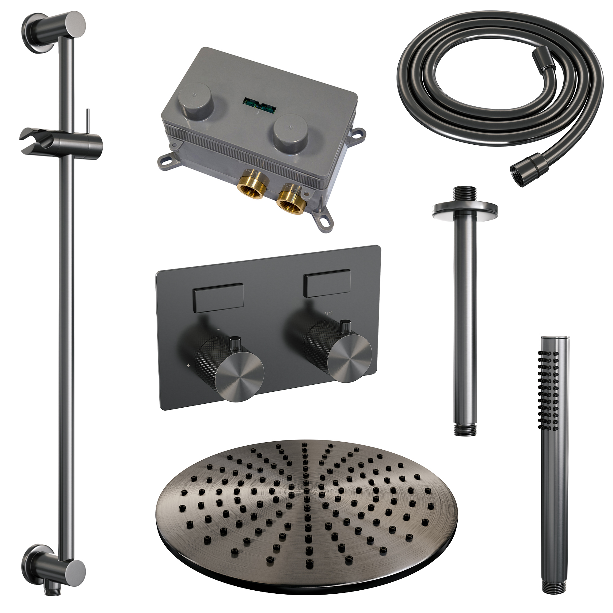 Deze complete inbouw regendoucheset in gunmetal PVD uitvoering combineert een stoere, luxe uitstraling met modern gebruiksgemak. De stijlvolle donker metallic afwerking geeft de badkamer een exclusieve en verfijnde look, terwijl de strakke vormgeving zorgt voor een tijdloos geheel. Dankzij het inbouwdesign ontstaat er een minimalistische en rustige uitstraling.
