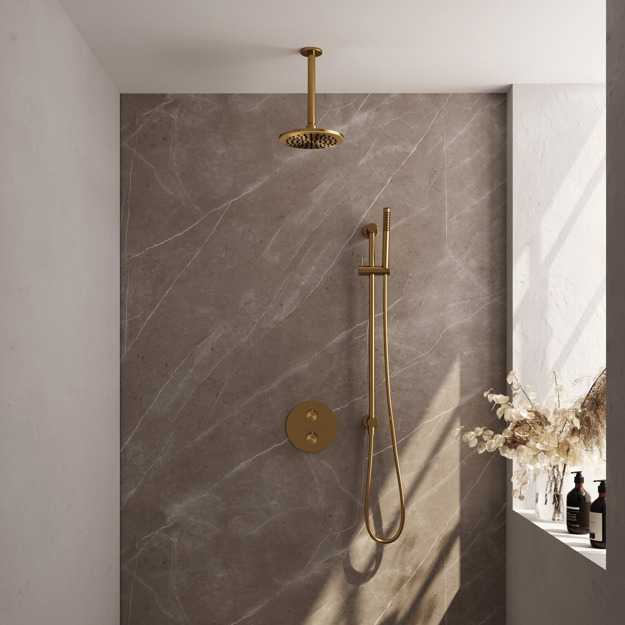 BRAUER Gold Carving thermostatische inbouw regendouche 3-weg rond SET 89 met 20 cm douchekop en plafondarm en staaf handdouche en doucheslang en geïntegreerde glijstang goud geborsteld PVD