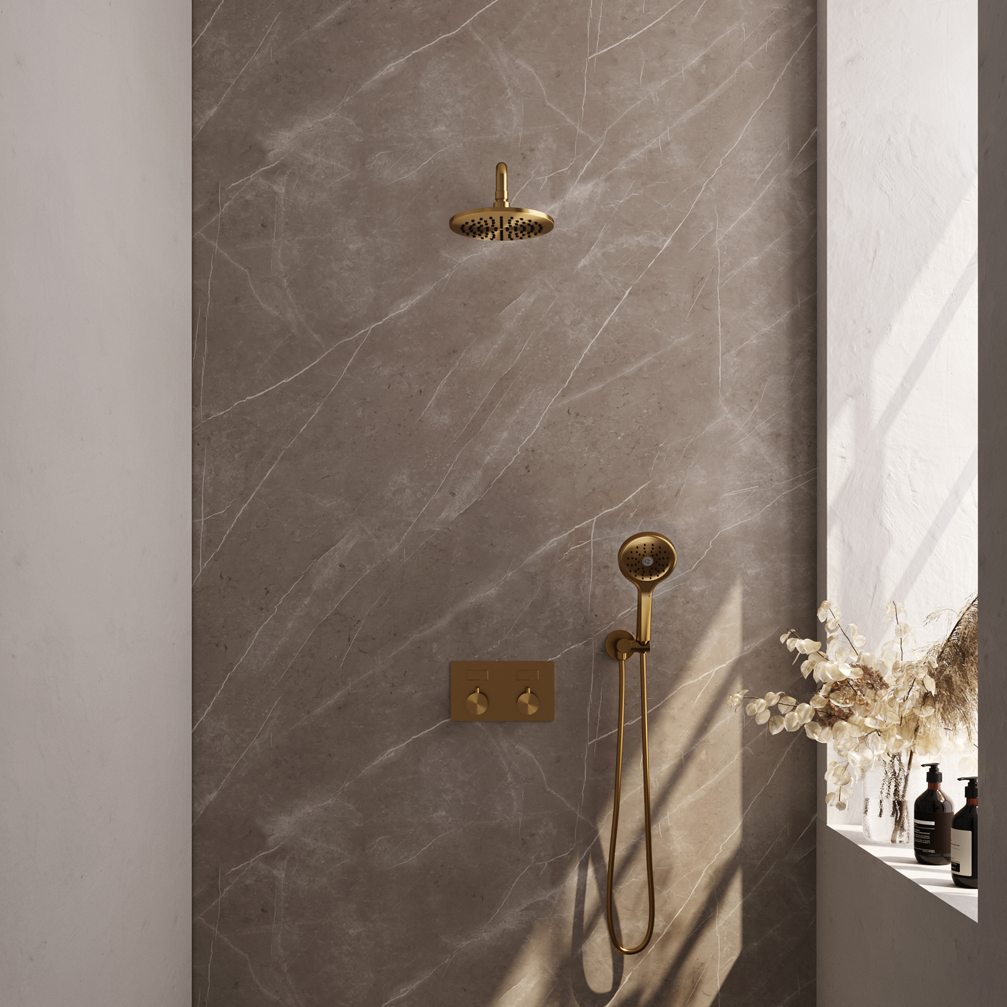 BRAUER Gold Edition thermostatische inbouw regendouche met drukknoppen SET 57 met 20 cm douchekop en gebogen muurarm en 3-standen handdouche en doucheslang en wandaansluitbocht goud geborsteld PVD