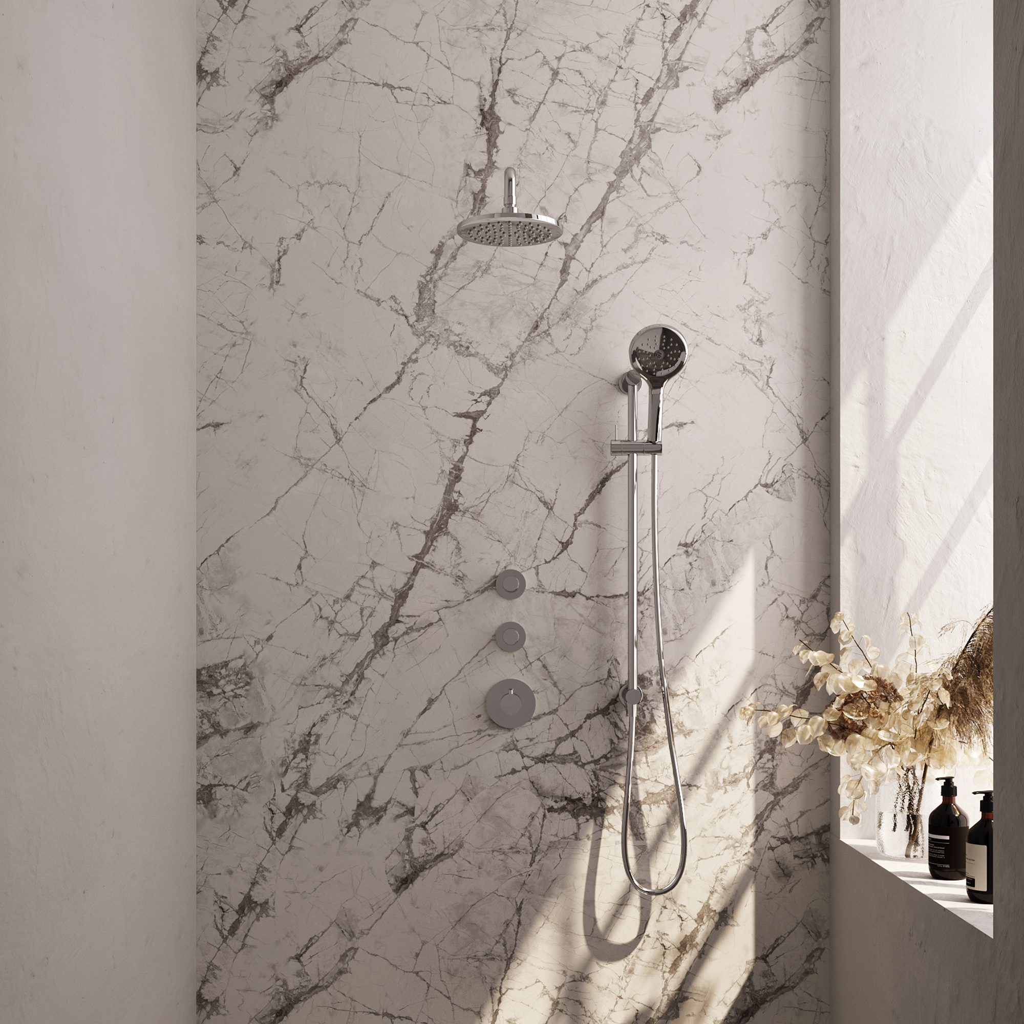 BRAUER Chrome Carving thermostatische inbouw regendouche SET 21 met 20 cm douchekop en gebogen muurarm en 3-standen handdouche en doucheslang en geïntegreerde glijstang chroom