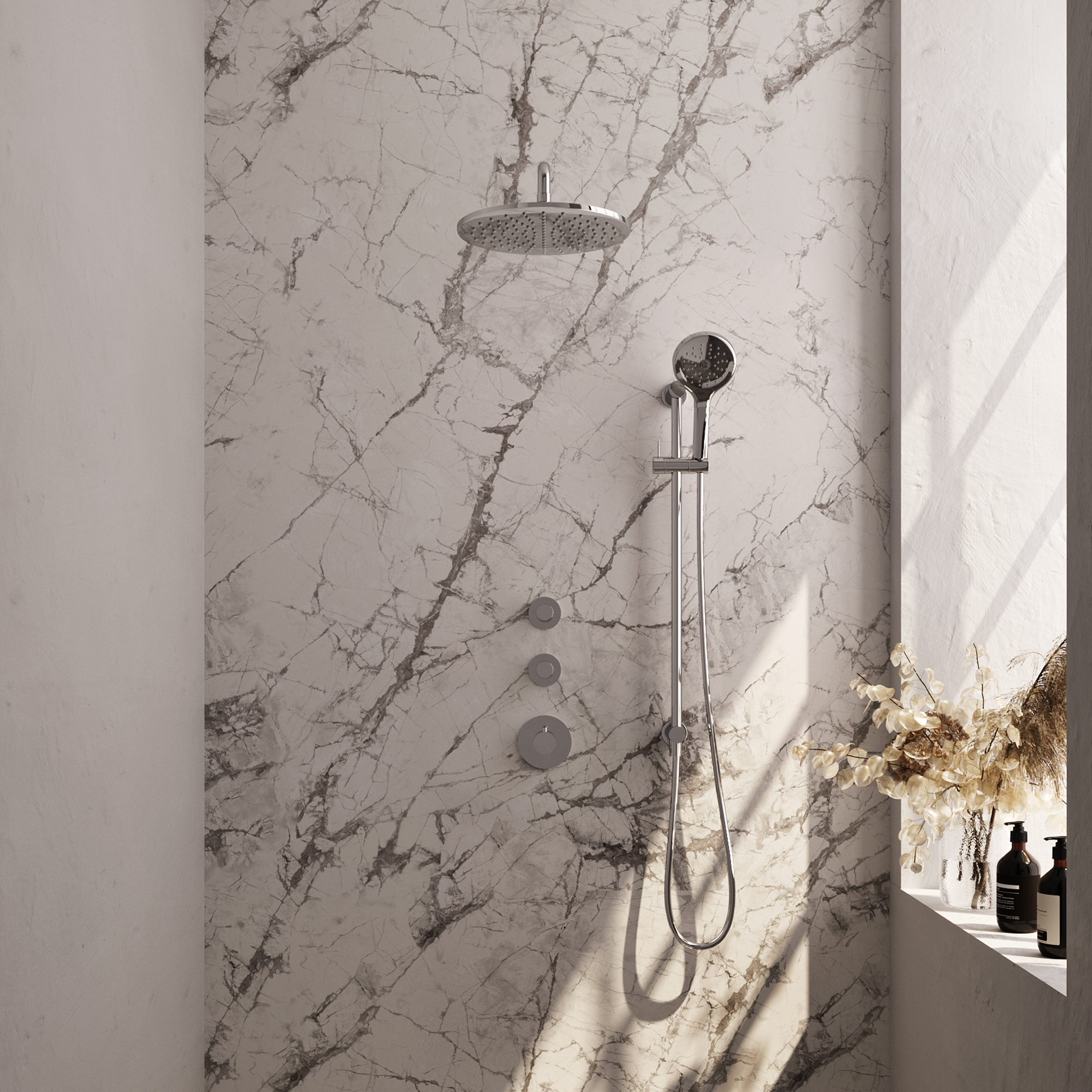 BRAUER Chrome Carving thermostatische inbouw regendouche SET 22 met 30 cm douchekop en gebogen muurarm en 3-standen handdouche en doucheslang en geïntegreerde glijstang chroom
